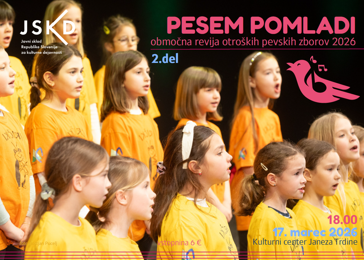 Javni sklad Republike Slovenije za kulturne dejavnosti – Območna izpostava Novo mesto vabi na območno revijo otroških pevskih zborov Pesem pomladi 2026 – 2. del, ki bo v torek, 17. 3. 2026, ob 18. uri v Kulturnem centru Janeza Trdine Novo mesto. Spletna stran dogodka.